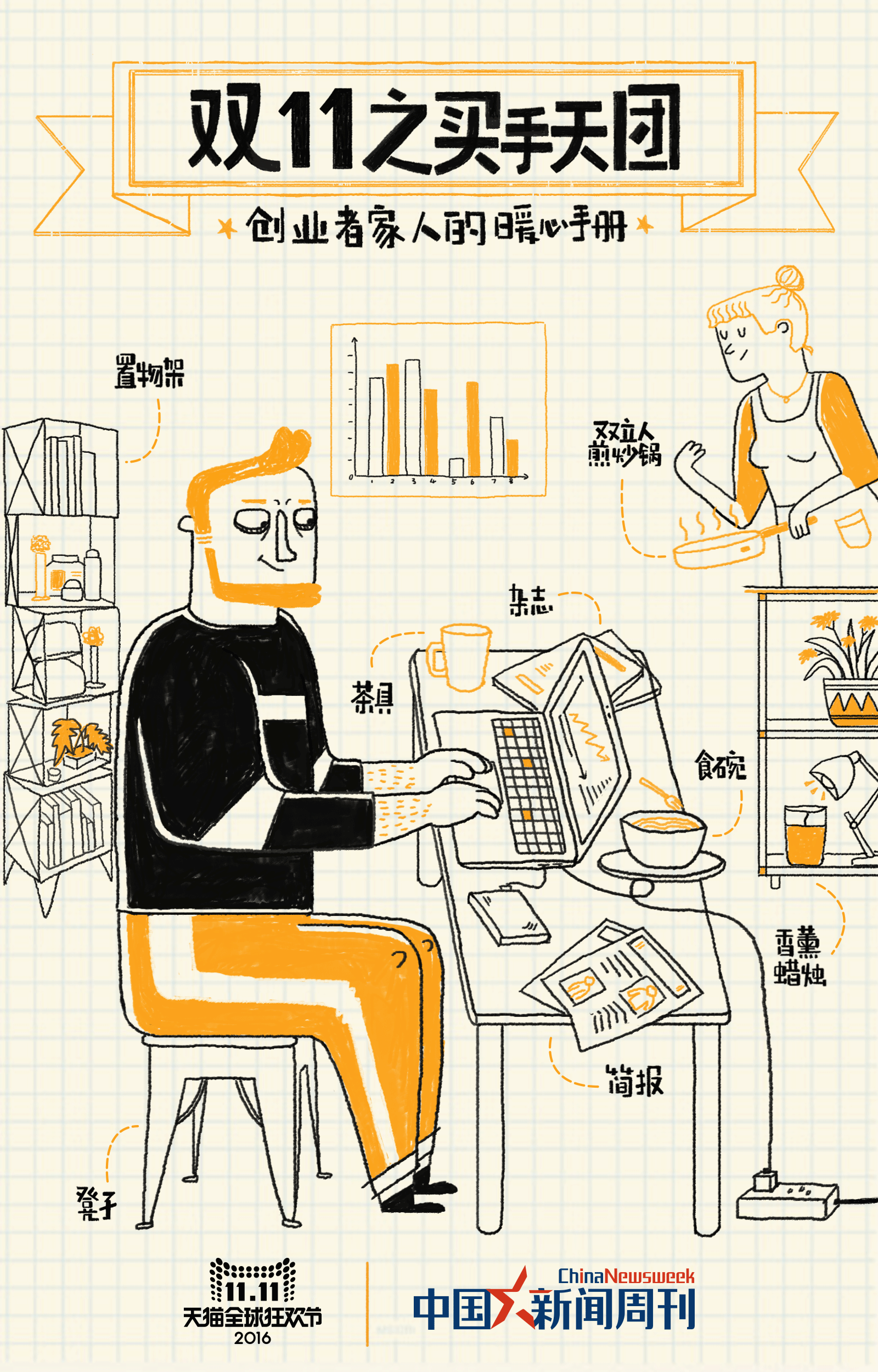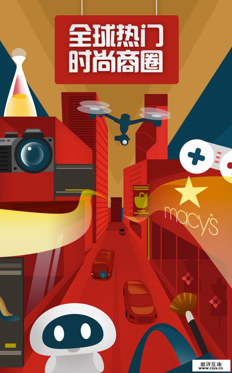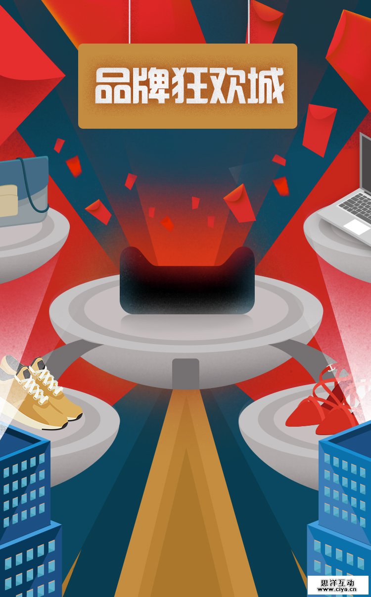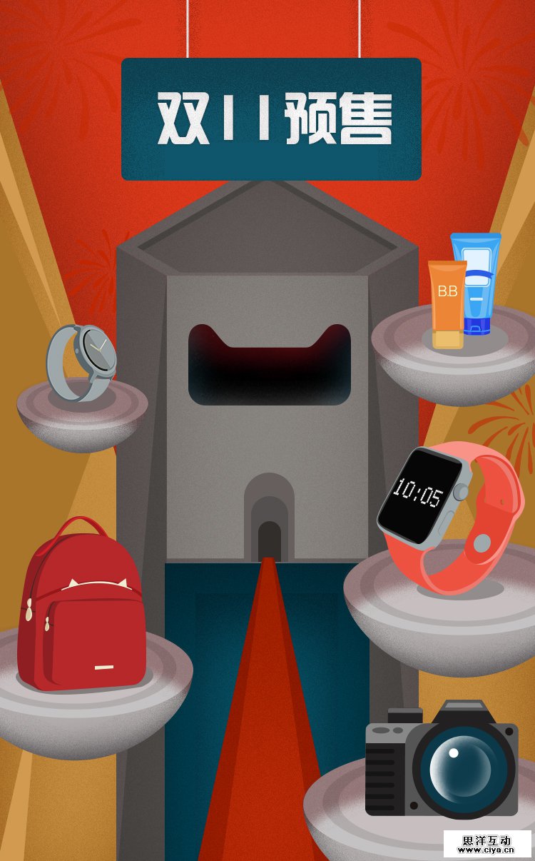 这次我们的双11总攻略不同于往年只是单纯静态图展示的形式,这次我们用欧美复古插画风格,创意将其制作成具有景深动态的,让用户身临其境,感受这一总攻略时间进度上的变化。 媒介投放上我们利用PC页面,无线端H5,加上一支创意视频,同时我们传播推广的渠道也比往年增加了微博微信上的推广和传播。