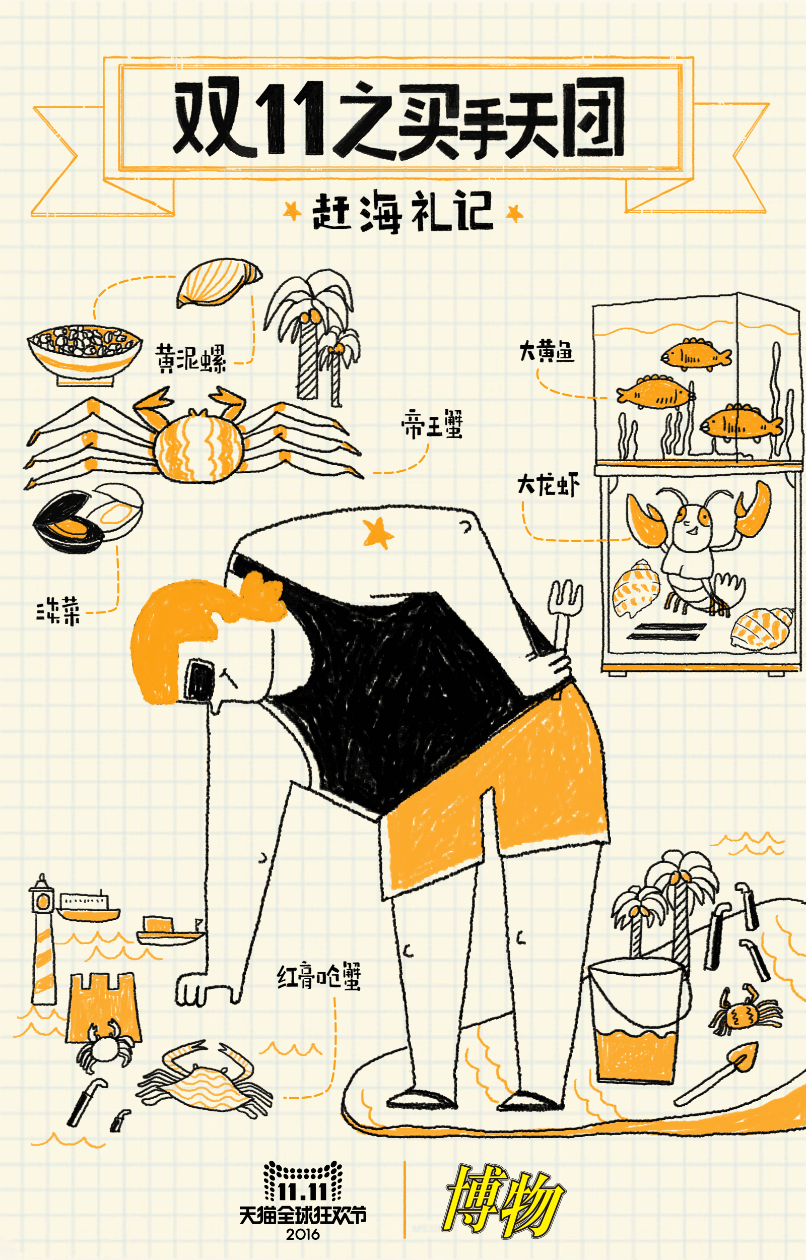 这一系列的海报,我们觉得可以做得更酷一些,结合传统版画纹理的效果和双11天猫公仔形象,我们创意出天猫分别从海陆空及太空出发的视觉特效,画面保持基本两个色调,让视觉更加集中在线条纹理和画面张力上,大繁归于大简。视觉冲击力更强,信息也更直接。这一组海报在微博上的也有大量的讨论和转发。
