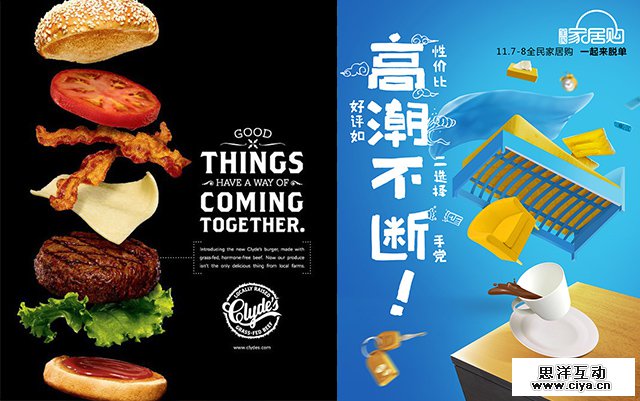 人的眼睛更喜欢有空间有层次的东西,这也是为什么3D电影比2D电影给我们带来的感官刺激要更强的原因,做设计的时候我们也可以去创造空间感,使设计里的元素在视觉上有前有后,有远有近,就像我们在现实中看到的场景一样。我们可以通过以下方法制造空间感:把主体3D化、添加倒影、利用有空间感的背景、在图层最后和最前面分别加一些小的、大的元素,并且模糊处理(模仿单反相机的景深效果)等。