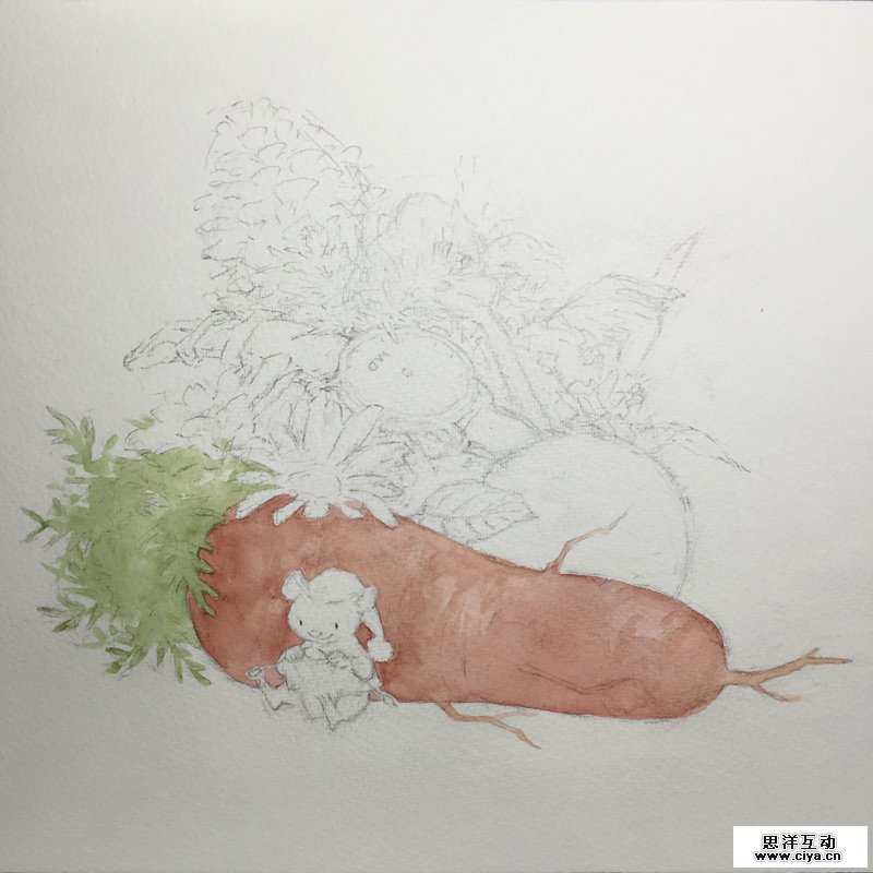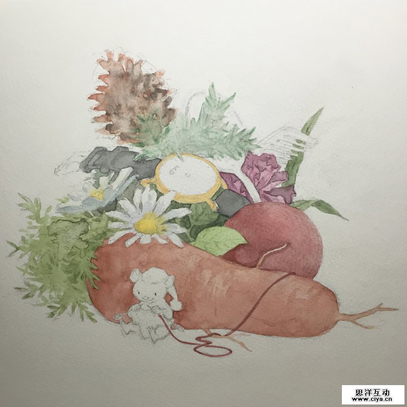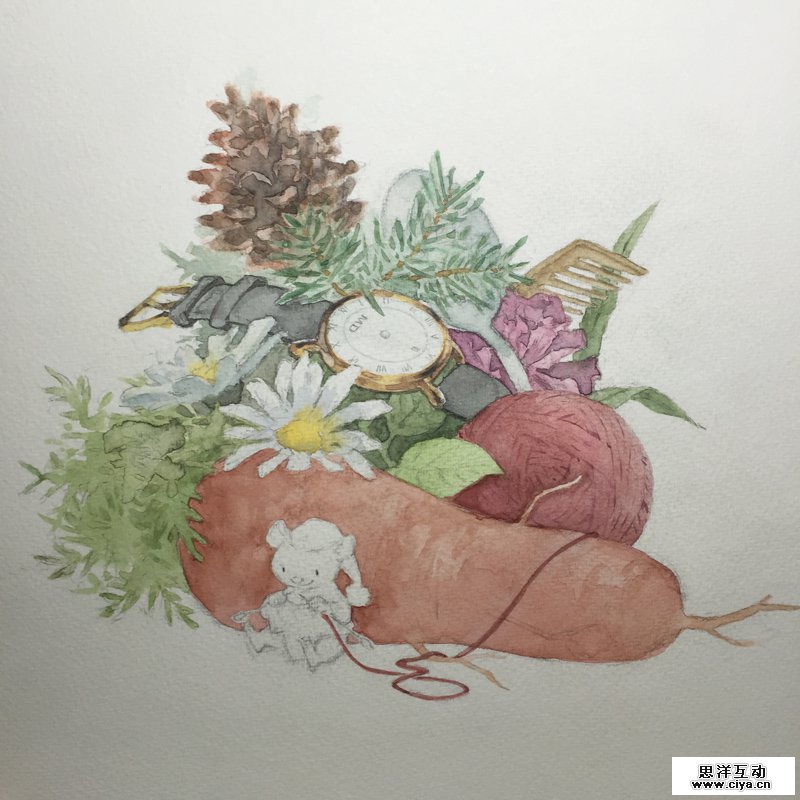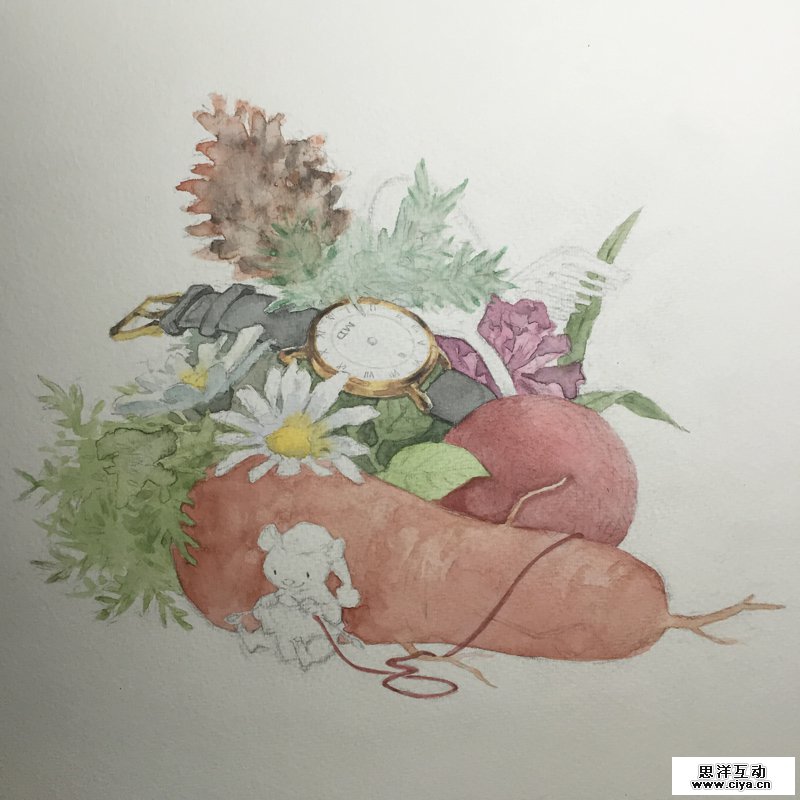 4.这样的画面氛围适合有一朵康乃馨,加上一朵紫色的康乃馨,然后开始刻画手表。