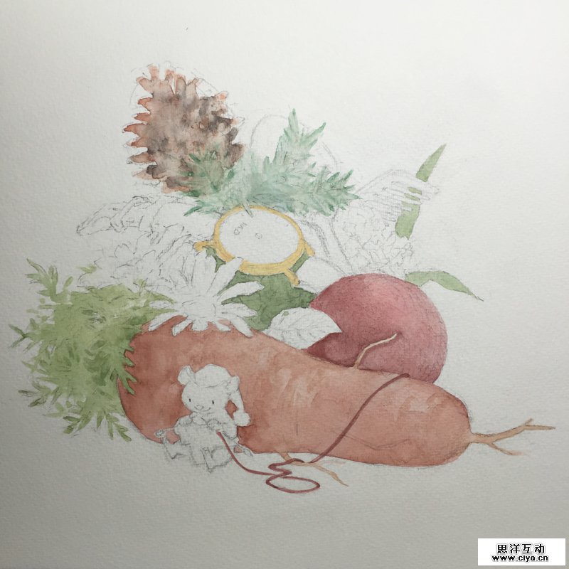 6.手表画好之后,刻画后面的松果和松针,注意松果上一片片的体积关系,松针也不要过于密集。