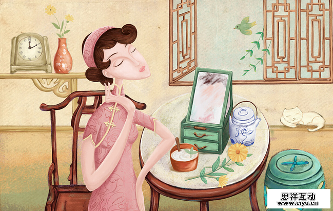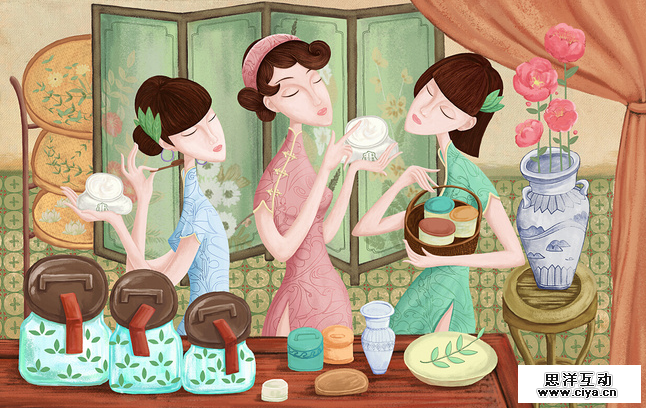 于是2012年,百雀羚推出了全新的“东方之美”视觉形象——三生花。三个插画形象分别代表了三种珍贵的护肤草本植物:三色堇、山茶花、金钗石斛。画面里是猫咪一样迷之傲娇+优雅的美人。