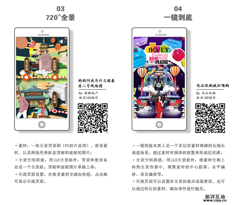 全景类H5可以说是16年最火爆的H5形式,而源头就是VML团队创作的淘宝造物节邀请函《ZAO》和天猫《尽情尽兴,尽在双11》H5,一个属于720°伪3D的全景,一个是长镜头递进的一镜到底。这类H5很考验设计能力,需要绘制很多图片素材,才能形成层次感。