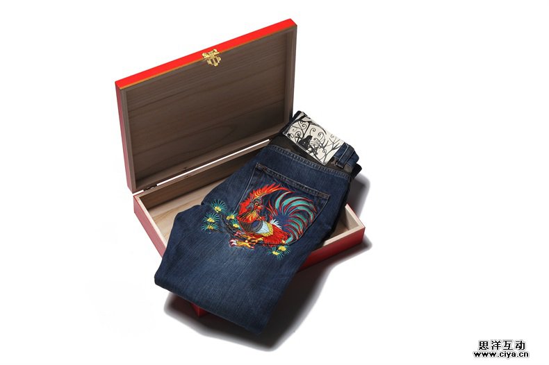 每年农历新年之际,miracle kill总会推出一款生肖限量款赤耳丹宁牛仔裤,今年也不例外,此次推出的是农历鸡年限量款。大公鸡的图案由我来主笔设计,栩栩如生,雄赳赳气昂昂,霸气十足!裤子本身有别于之前都是原色或者普洗的工艺,此次采用了泼漆洗水工艺来处理这款牛仔裤,舒适度,实用性更胜一筹,火鸡袋上有象形文字鸡的刺绣,后面也有闻鸡起舞4个汉字的刺绣设计,修身的裤型设计,也让潮流度激增!在包装方面也升级为彩印的木盒包装,非常精致!旭日东升,闻鸡起舞。