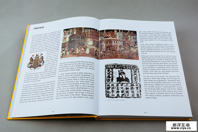 全书以四个设计时代的风格特点为框架,按照风格演化的顺序安排章节,四个章节均以 前言+访谈+LOGO展示+具体案例 的形式展开,每个章节依照不同的时代风格做不同的设计处理。