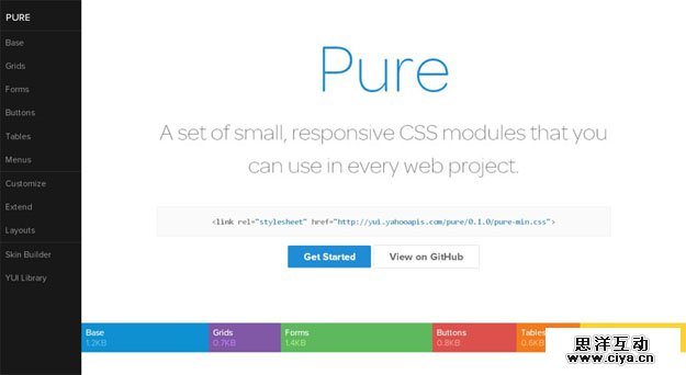 Pure CSS 是一组小型的响应式CSS模块,可以应用于每个Web项目。这个仅有5.7KB大小的压缩包非常便于使用,制作的时候考虑过移动端的需求,与此同时,所有的CSS代码都经过仔细斟酌,在确保功能的前提下尽量做到小巧而全面。