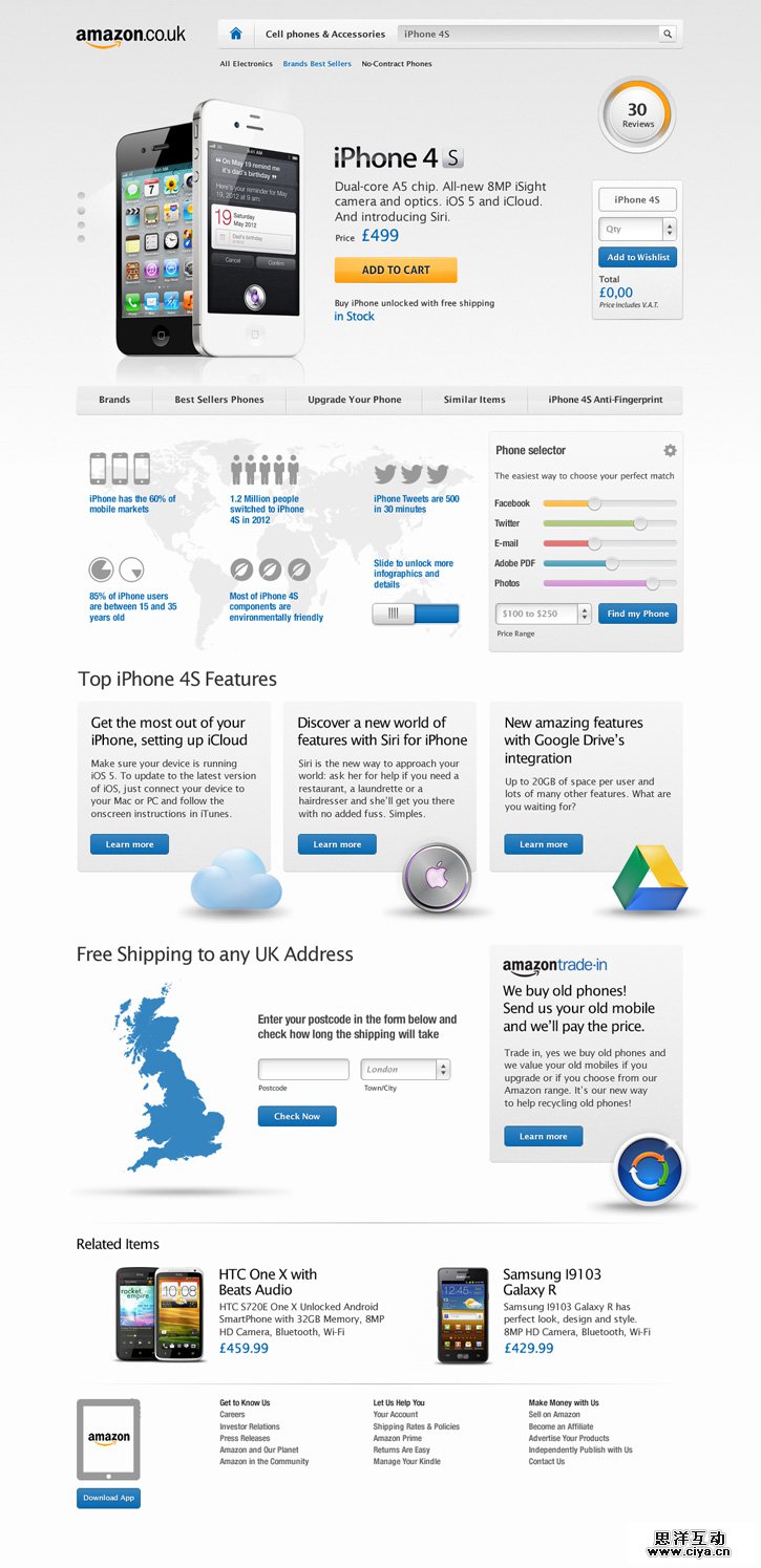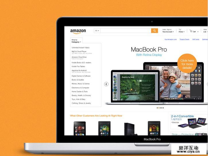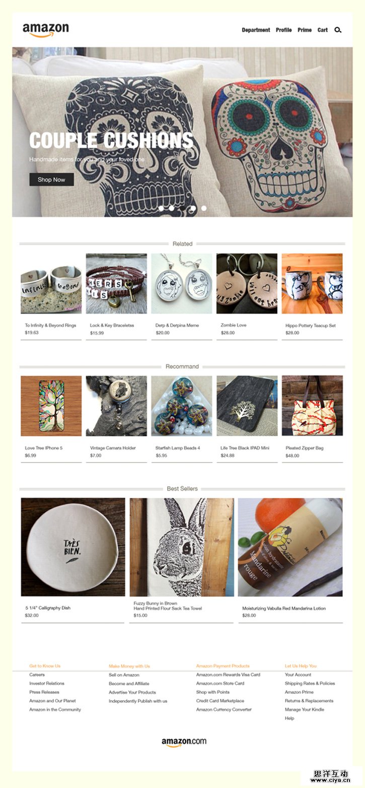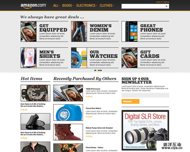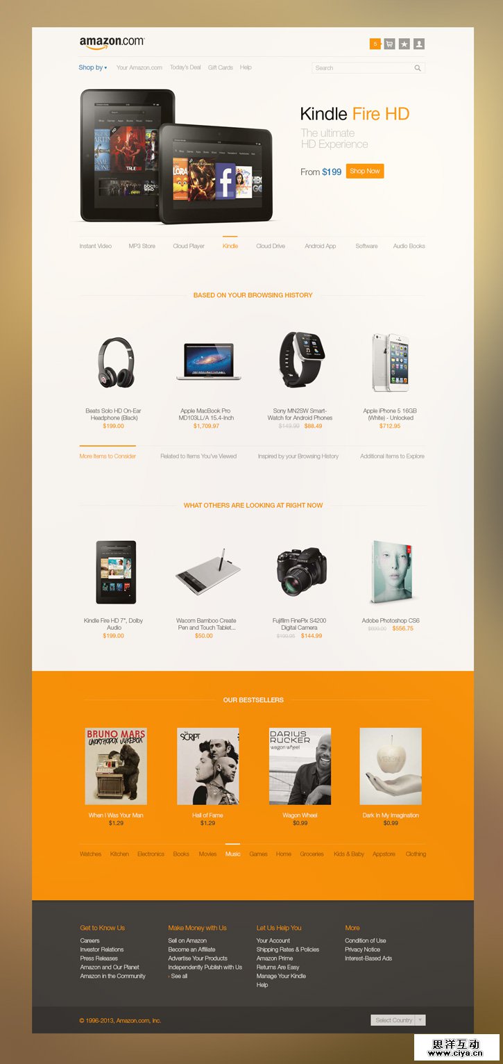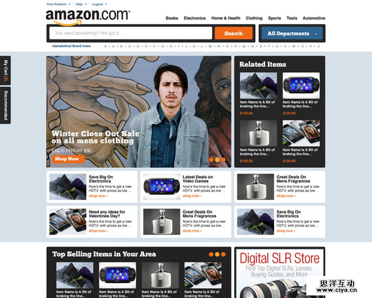 Bluroon 对 Amazon 的设计非常现代,扁平而精致。底部BestSellers和页脚采用了亮眼的橙色深灰,令页面整个活了起来。
