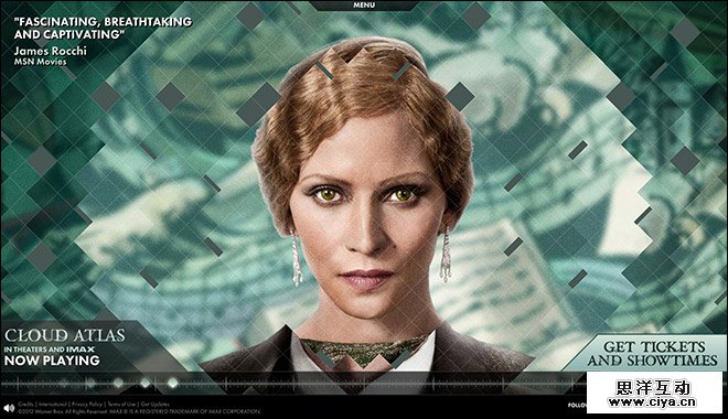 Clouds Altas《云图(2012)》的官网创意是一个不断裂开的镜面,层层剥离的镜面中浮现出《云图》故事里一代代的人物。