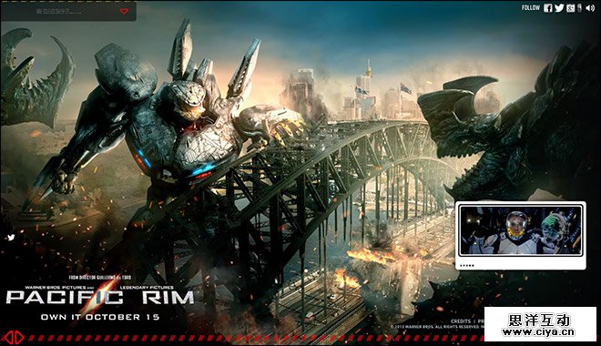 打开Pacific Rim《环太平洋(2013)》的官网,会看见一个可以横向滚动的图片“展示橱窗”,让人印象深刻。