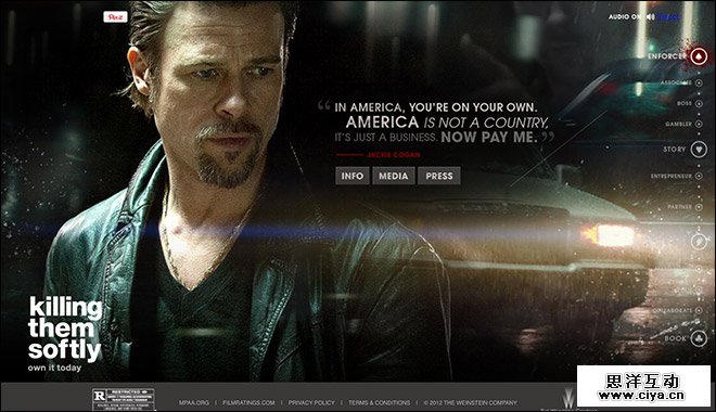 Killing Them Softly《温柔杀戮(2012)》的官网让人直观的看到主要人物和他们的经典台词,细致的边侧导航栏也很有意思。