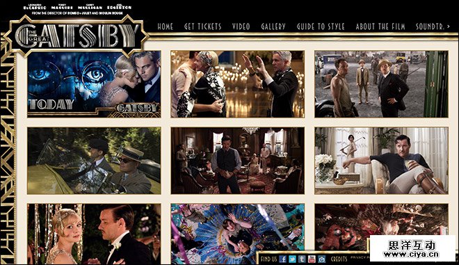 Great Gatsby《了不起的盖茨比(2013)》的官网没有花哨的动效,一如电影版复古。但字体和边框的设计都很讲究。