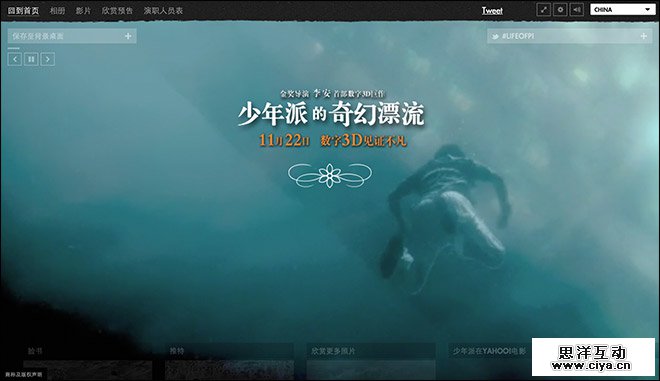 Life of Pi《少年派的奇幻漂流(2012)》的官网的背景是全幅视频,循环播放着少年派电影中雄奇精美的电影画面。