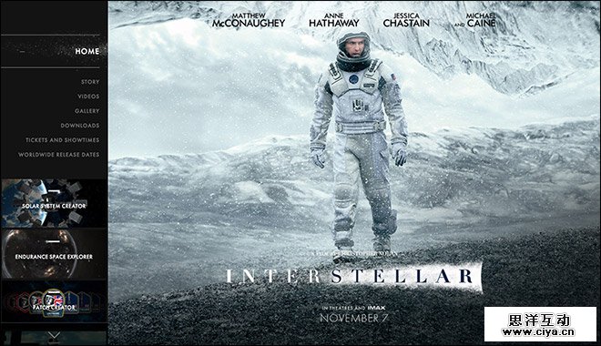 Interstellar《星际穿越(2014)》的官网和上述优秀网页一样,都有一个十分精致的加载项的设计,它采用了星空的景象——许多分散的白色星星,最后在加载成功时白色星星聚拢,变成一道引导图片出现的白光。