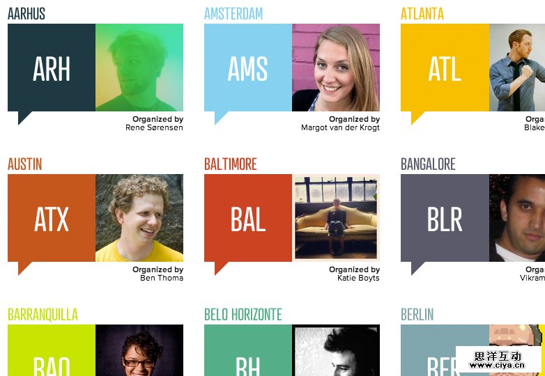 在这个名为CreativeMornings的网站中,每个章节都用不同的色彩标示出来,同作者头像组合到一起。这种视觉元素贯穿于整个网站,这些色块会有下拉菜单,并且有着各种不同的边缘、形状和好玩的样式。加载内容的时候,还有漂亮的加载动效。大胆的用色,精致的细节,这个网站简直是高大上的典范啊。