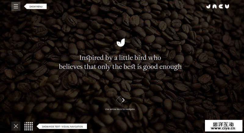一图胜千言,所以Jacu的设计师打算用大量美图来呈现他们的咖啡。左下角独特的矩阵式图片导航可以让你快速定位到不同的图片,那些精美的展示图足以让你直观感受到这个品牌的精致与细腻。有意思的是,他们依然准备好了足够的文字说明。点击左下角的+号,图片变为背景,并且加上了半透明的黑色蒙板,文字说明浮现,和谐而对比明显,保证可读性也营造了氛围。