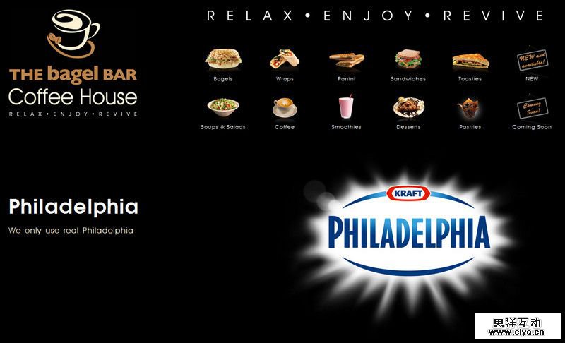 网站配色基本全是取自咖啡,黑白灰和棕色。黑色和白色一样,都能凸显内容,这也是为什么网站上那些食物是如此的醒目。作为餐饮类网站,这种配色似乎偏门了点,但是实际效果很不错哦。
