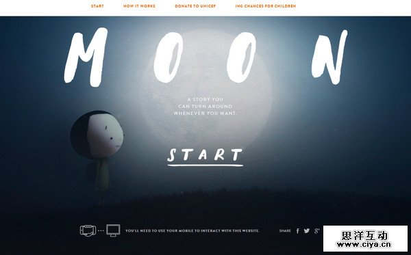 Moon这个脑洞大开的网页,被推荐到Awwwards上时曾得到许多设计师的盛赞。设计师以讲故事的形式来呈现尖锐的社会问题,巧妙地让可爱的艺术感染力同人文关怀充分结合到一起,发人深省。
