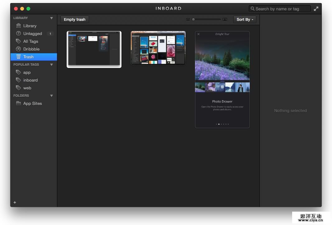 Inboard中所有删除的图片都会进入到Trash模块中,在这里你还有一次后悔的机会。这里再清除掉,应用就真的会把它彻底删掉了。