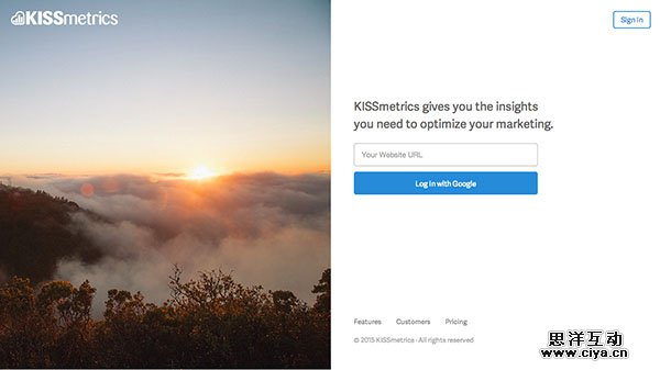 Kissmetrics 的着陆页设计不仅遵循了极简风,而且呈现的内容非常到位。虽然左侧的图片看起来真的和这个网络分析APP关系不大,但是和左侧的入口和谐地共存在一起,因为用户不会迷惑,因为在这里他们能做的无非是注册和登录。