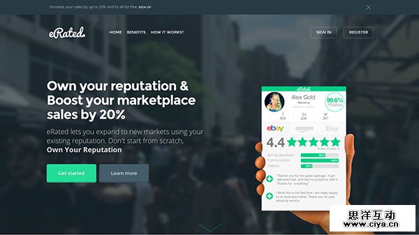 如果你是电商从业者,那么你应该很清楚声誉的重要性,而eRated所提供的服务就是帮你跟踪你的声誉变化,并帮你改善它。网站使用了许多大胆的字体设计和排版设计,彩色的图标和独树一帜的平面插画,整个网站设计感十足,还弥漫着“信任我”的氛围。