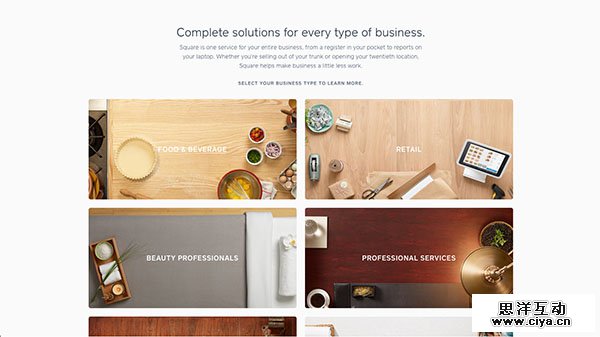 Square 的官网设计在圈内属于被传颂已久的经典。来自Adobe和苹果的设计团队成员,使得整个团队现在的时尚感上保持得非常好,干净,像素完美。