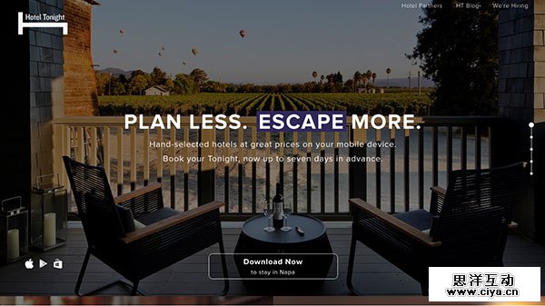 Hotel Tonight 是一个预订当天酒店房间的工具。着陆页的独有设计,使得网页有种独立的网页开发者们的作品风。这些图片的排版和处理有着极为清晰的处理思路,搭配好了会让你有一种探索感。