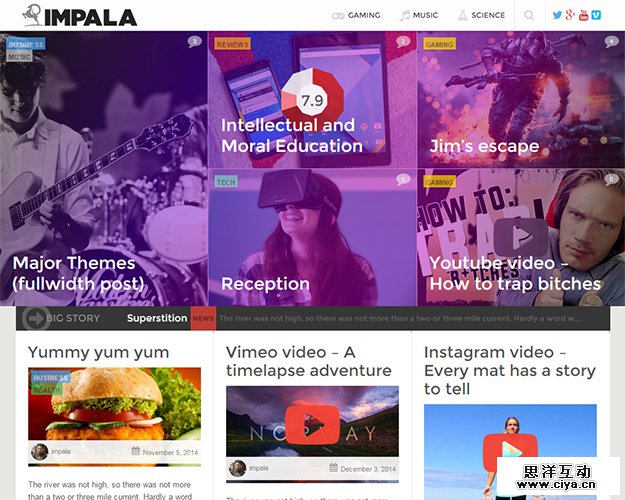 Impala 是一个层次分明、灵活自由的现代扁平风响应式主题,其中融入了不少Google的Material Design的设计风格。这套主题中还包含了不少最好用的第三方工具,包括:Bootstrap, Visual Composer, Redux Framework & Redux Metabox。