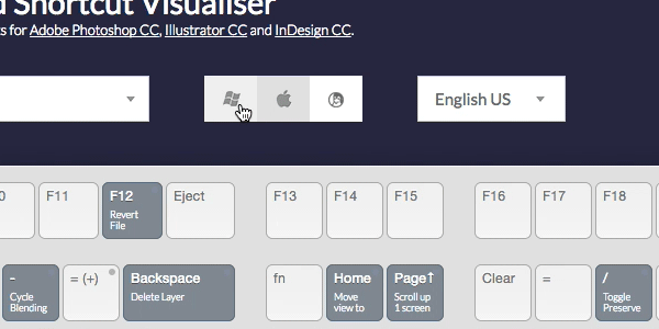 鼠标直接点击Shift、Command/Control或Alt,可以看到每个搭配快捷键的用法。举个栗子,在Photoshop – Win 的选择下,单击Ctrl就能看到S的快捷键显示 Save ,即 Ctrl + S 是保存的意思。