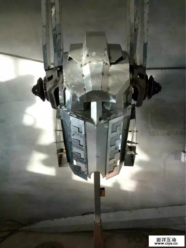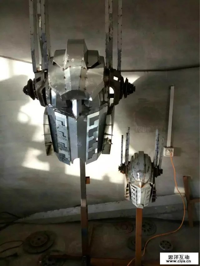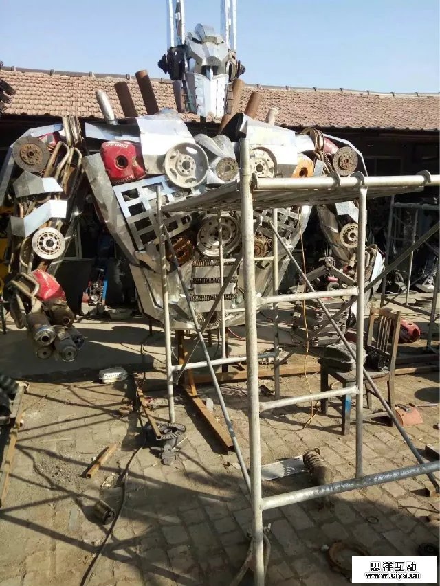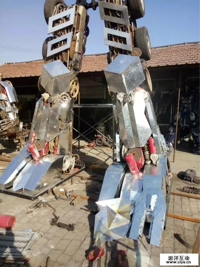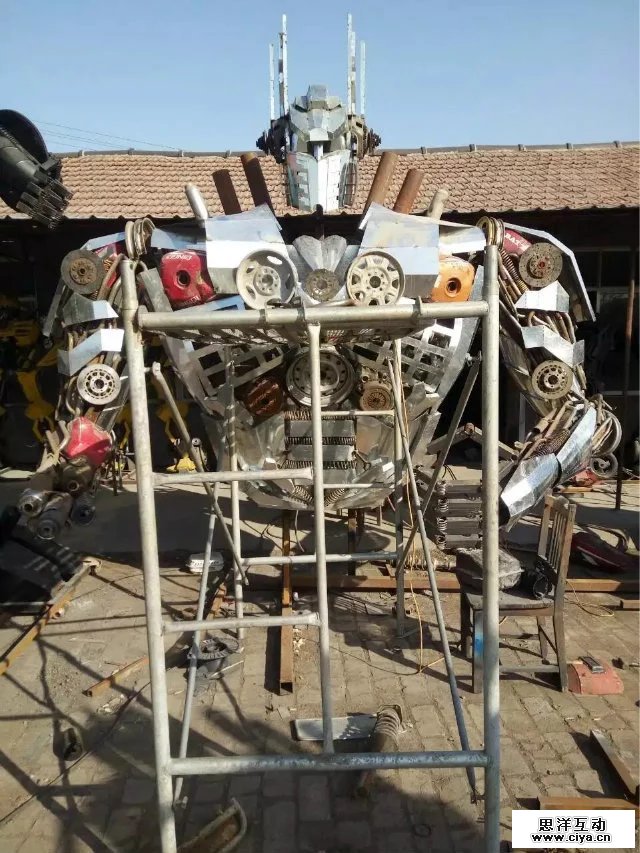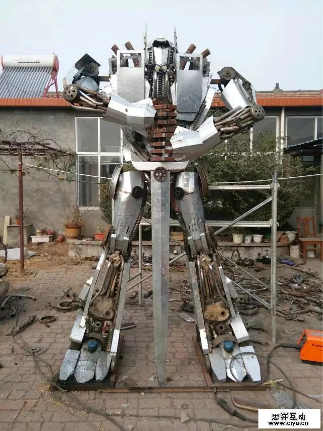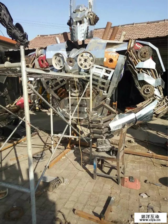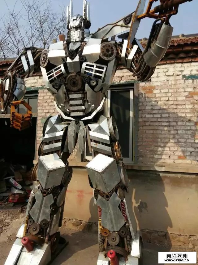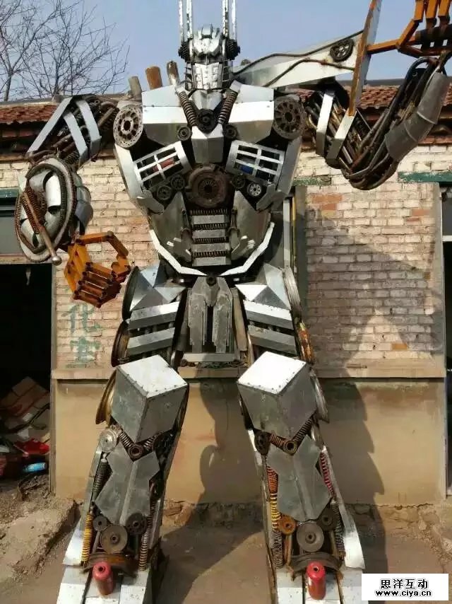 根据电影变形金刚原尺寸呢打造等比例金属模型,相似度百分之八十!!!材料用铝材、铁板、报废汽车零部件、废旧回收的金属。