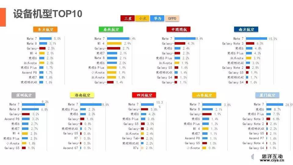 航司APP用户设备品牌中,华为手机无疑成为商旅出行用户的代表,九大航司APP的TOP手机品牌均为华为;