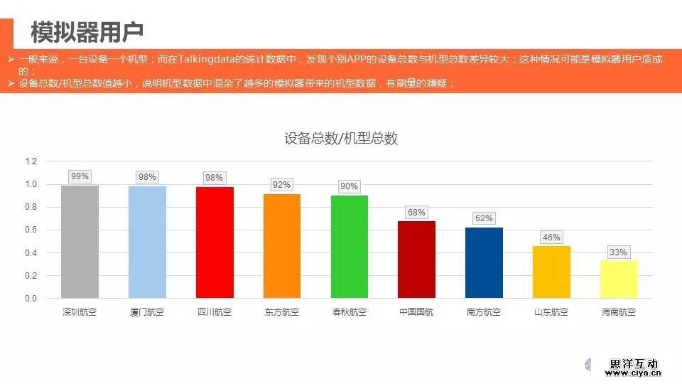 一般来说,一台设备一个机型;而在TalkingData的统计数据中,发现个别APP的设备总数与机型总数差异较大;这种情况可能是模拟器用户造成的;