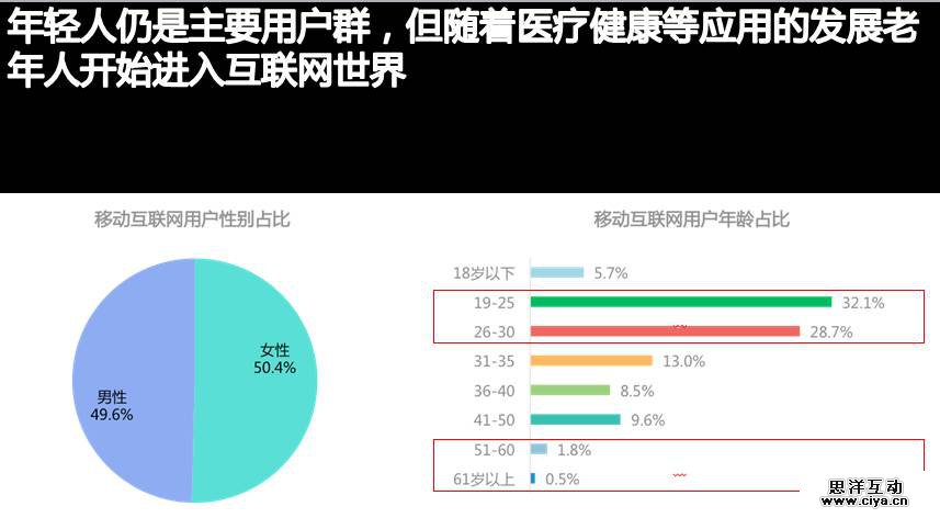 年轻人是移动互联网的主要的用户群,30 岁以下的用户居多,50 岁以上渐渐有所增加,这表明随着医疗健康等应用的发展,老年人也开始进入互联网世界。