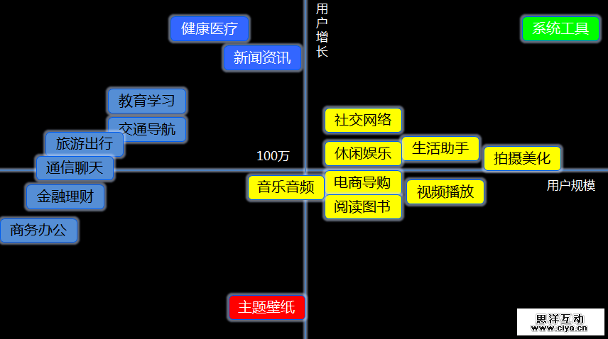 健康医疗和新闻资讯(蓝底白字)这两个应用的用户目前没有达到最大规模,成长性很好,在这个市场如果具有独特的竞争力,机会相对会很大。