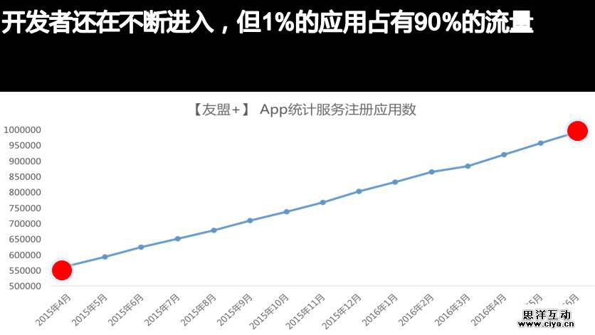 首先从友盟+覆盖的App数据来看,从2015年4月至2016年6月连续14个月App数据已经增长将近一倍,一方面是友盟+市场认知度得到了认可,另一个主要的原因是市场自然增长吸引的开发者不断进入移动互联网,1%头部应用拥有90%的流量,这个市场后进者想超越成长起来,挑战很大!