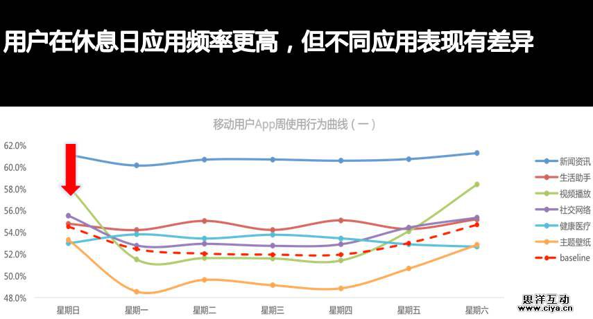 工作日和休息日应用表现也不一样,总体上休息日高工作日低,通过分析可以看出视频播放休息日应用量高,超过均值。金融理财工作时间使用频率较高,旅游出行则是周五迎来使用的小高峰,旅游服务开发者可抓住这一峰值进行推送或促销效果更佳。