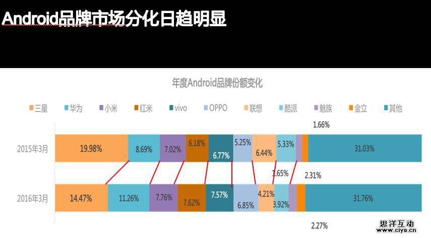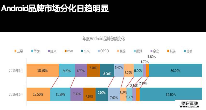 安卓品牌在中国市场逐渐分化,从2015年的6月30.2%到2016年6月增加至35.5%的这部分数据主要是由一群小品牌组成的。叠加数据从上个季度的同比数据来看,OPPO从15年至16年相对来说是健康成长,每个季度呈1%的增长,华为增速降缓,下一步怎么发展就要看产品如何创新。