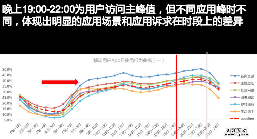 在时间分布上,总体上来看移动和PC端不同的是:移动端主峰值在夜间,PC端一般在早上8点至10点,不同场景在时段上还是有差异,金融理财和电商导购都是在日间使用的频率较高,整体来看移动端碎片化很严重,明显的表现出应用场景和应用诉求在时段上的差异。