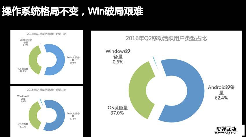 从操作系统来看的话,对比2015年第四季度以及2016年第一、二季度总体来看没什么变化,Windows想破局还比较难,互联网行业的特点就是:谁先占先机谁拥有市场。