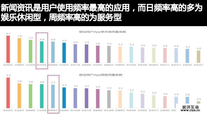 新闻资讯是用户使用频率最高的应用,而日频率高的多为娱乐休闲型,周频率高的为服务型,读书阅读类也进入了TOP5。随着移动互联网向细分领域的服务产品发展,规模上不会继续扩大,而在用户的粘性和忠诚度会更胜一筹。
