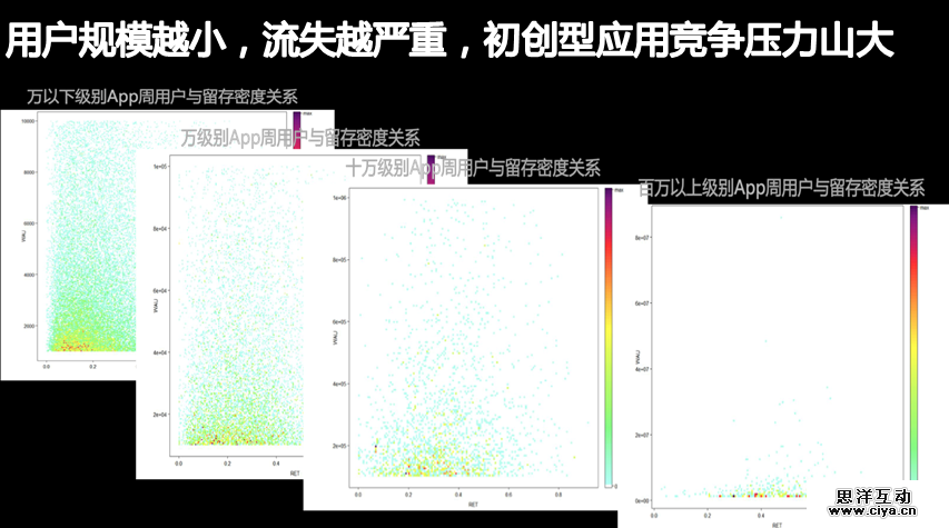 用户规模越小,流失越严重,初创型应用竞争压力山大。当App用户规模越小时,其实流失越大。初创开发者不要一门心思就想去拉新,做好产品用户体验留住打开你App的用户,将会达到事半功倍的效果。