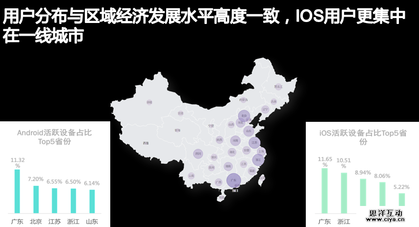 地域分布和区域经济发展高度一致,iOS 用户更集中在发达城市。