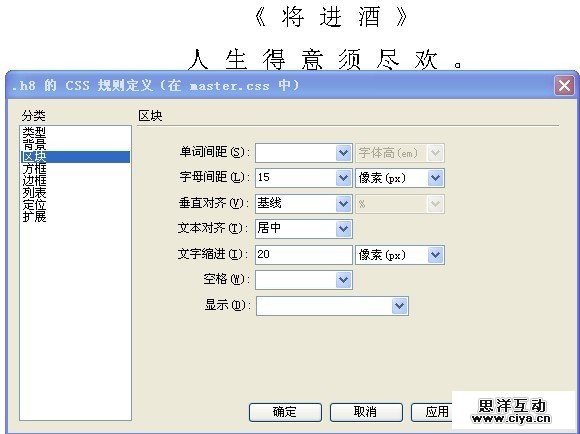打开【CSS规则定义】对话框的【区块】选项卡,按下图设置各项参数,并应用于所选诗词,能够设定诗词的对齐方式、字符缩进、间距等。