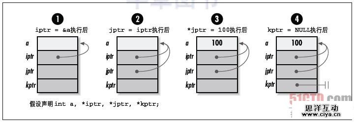回想一下,一个指针其实只是一个变量,它存储数据在内存中的地址而不是存储数据本身。也就是说,指针包含内存地址。很多时候,即使是有经验的开发人员都很难形象表达这种不太直观的数据关系,特别是在处理类似于指向其他指针的指针这种更复杂的指针结构时就尤为明显了。因此,用来理解指针的最好方法之一就是绘制图表(见图2-1)。指针通常都是按位置用箭头一个一个连接起来,而不是在图表中画出实际的地址。当指针不指向任何数据,也就是说指针被设置成NULL时,用两条竖线来表示(见图2-1,第4步)。