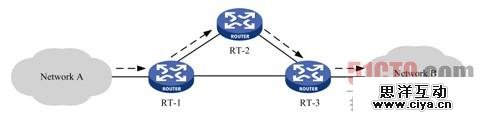 路由器的转发特点是逐跳转发,在如图1-1所示的网络拓扑中,Network A的IP报文要想发送给Network B,首先发给RT-1,RT-1收到后根据报文的目的IP地址查找路由并将报文转发给RT-2,RT-2收到后根据报文的目的IP地址查找路由并将报文转发给RT-3,RT-3收到后将报文转发给Network B。这就是路由转发的逐跳性,即路由只指导本地转发,而不影响其他设备转发,设备之间的转发是相互独立的。