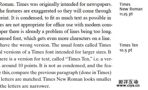 比这个更不负责任的是用 Times New Roman,Times New Roman 其实是一种压缩 (Condensed) 了的 Times,比原来的 Times 更细长,更不易读了。下面的一个比较应该比较容易分辨出优劣来: