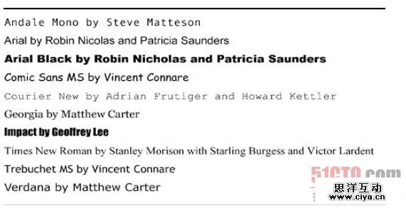 这些字体是 Andale Mono (monospaced sans serif typeface)、Arial (sans serif)、 Comic Sans MS (script)、 Courier New(monospaced slab serif)、 Georgia(serif)、Impact (sans serif)、Times New Roman (serif)、Trebuchet MS (humanist sansserif)、Verdana (humanist sans serif) 和Webdings (dingbat)。