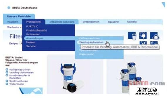 下面展示的网站(Brita.de)犯了这样的错误。菜单太难使用,因为即使鼠标指针轻微失去焦点, 你就得从头开始。注意工具提示,它挡住了导航信息。实际上,为了使子菜单可见而且可读,将下拉导航中的工具提示全部移除是个好主意。