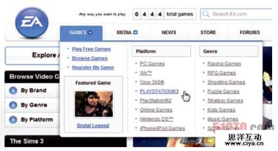 一个漂亮、整洁、合理组织的巨型下拉菜单,来自EA.com。 注意紧挨着“Games”和“Media”列表项目的可视箭头(visual indicators), 它们清楚地告诉用户在下拉菜单中将提供进一步的导航选项。 |