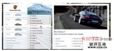保时捷网站有一个大的巨型下拉菜单。因为菜单有一个 广阔的焦点区,使导航变得友好易用。 |