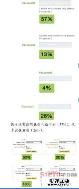 注册表单通常不包含分散注意力的内容,这样有助于使用户专心完成注册。它们通常不包含悬浮、动态和聚焦等效果。提示通常放在输入框的下边(57%)或者放在输入框的右边(26%)。